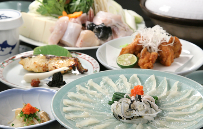 お通し・ふぐ刺し・焼物・ふぐ唐揚げ・ふぐちり・ふぐ雑炊・デザート